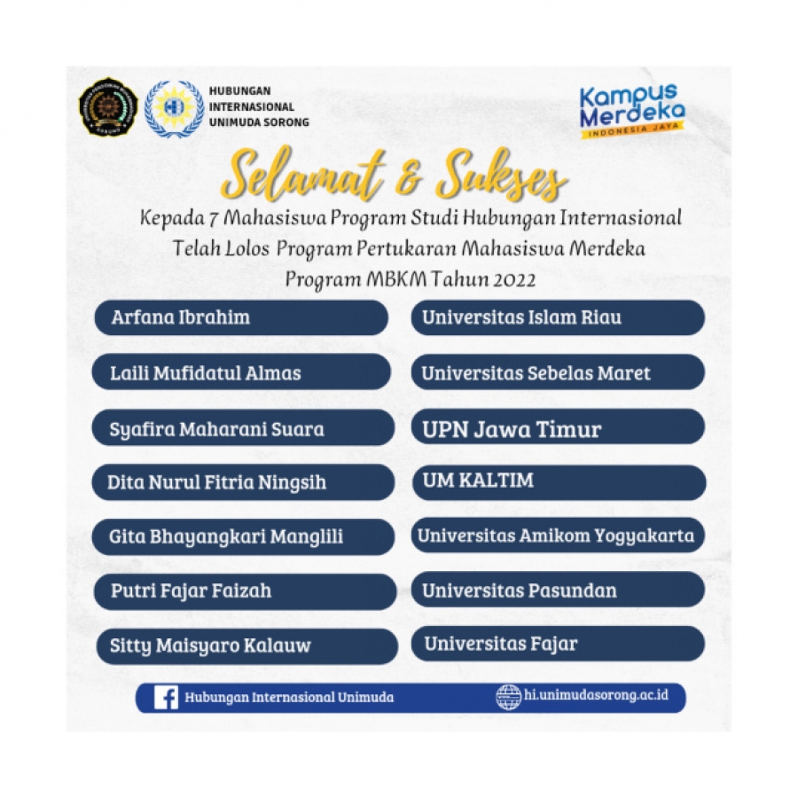 Tahun 2022, Program Mahasiswa Merdeka #2 membuka pendaftaran kedua dibulan Juni lalu, di ikuti oleh 8 Mahasiswa program Studi Hubungan Internasional. Hasil seleksi yang di umumkan pada bulan Juli 2022, 7 Mahasiswa program Studi Hubungan Internasional berhasil lolos mengikuti Program Kampus merdeka di 7 Kampus yang berbeda dengan prodi yang sama. 7 peserta yang lolos yaitu: 1. Syafira Maharani Suara: Universitas Pembangunan Veteran Jawa Timur, 2. Putri Fajar Faizah: Universitas Pasundan, 3. Dita Nurul Fitria Ningsih: Universitas Muhammadiyah Kalimantan Timur, 4. Arfana Ibrahim: Universitas Islam Riau, 5. Sitty Maisyaro Kalauw: Universitas Fajar, 6. Gita Bhayangkari Manglili: Universitas Amikom Yogyakarta. 7. Laili Mufidatul Almas di Universitas Sebelas Maret.