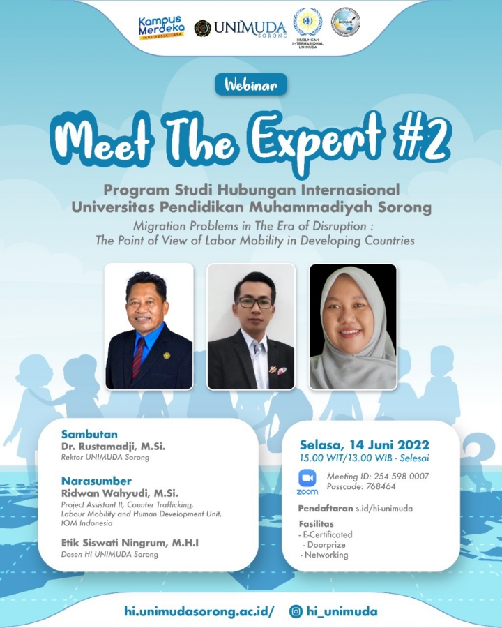 Selasa, 14 Juni 2022 Prodi Hubungan internasional gelar webinar bersama dengan IOM Indonesia membahas tema yang sangat menarik yaitu “Migration Problems in The Era of Disruption : The Point of View of Labor Mobility in Developing Countries”. Kegiatan webinar ini merupakan series kedua dari agenda rutin yang dilakukan oleh prodi Hubungan Internasional yaitu Meet The Expert #2, yang bertujuan untuk memberikan pengetahuan dan kesempatan bagi mahasiswa/i Prodi Hubungan Internasional khususnya untuk dapat belajar serta bertanya langsung kepada para akademisi dan praktisi Hubungan Internasional. Pada webinar kali ini Prodi Hubungan Internasional mengundang perwakilan Internasional Organization for Migration (IOM Indonesia) untuk yaitu Bapak Ridwan Wahyudi, M.Sc. Bersama dengan dosen Prodi HI UNIMUDA yaitu Ibu Etik Siswati Ningrum, M.H.I. untuk membahas fenomena permasalahan migrasi di era disrupsi dari sudut pandang mobilisasi tenaga kerja negara berkembang. Kedua narasumber membahas dalam 2 perspektif, yang pertama dalam ranah praktis IOM Indonesia sebagai organisasi antarpemerintah (intergovernmental organization) concern terhadap permasalahan migrasi dan mobilisasi tenaga kerja, IOM Indonesia telah banyak menginisiasi paket kebijakan bahkan melakukan tindakan pencegahan, perlindungan hingga penanggulangan permasalahan secara langsung untuk meminimalisir permasalahan terkait migrasi. Ridwan Wahyudi menambahkan “ Disrupsi merupakan fenomena yang harus dihadapi oleh pemerintah saat ini, inovasi yang menyebabkan perubahan secara besar-besaran atau mendasar ke dalam sistem yang baru. Para aktor HI diharuskan untuk melakukan penyesuaian menghadapi era disrupsi dan menemukan paket kebijakan yang sesuai dengan kebutuhan serta keadaan dunia internasional saat ini dalam menyelesaikan masalah terkait migrasi dan mobilisasi tenaga kerja”. Dalam ranah akademis ibu Etik Siswati Ningrum menambahkan “bahwa permasalahan terkait migrasi dan era disrupsi merupakan keniscayaan yang harus dihadapi. Dalam ranah teori globalisasi telah menghilangkan batas antar negara, sehingga mobilisasi manusia menjadi tidak terbendung lagi, dalam proses interaksi tersebut akan ada saja masalah atau konflik yang ditemui dan pemerintah bahkan aktor HI yang lainnya harus siap menghadapi berbagai perubahan serta melakukan penyesuaian secepat mungkin untuk menyelesaikan masalah tersebut.